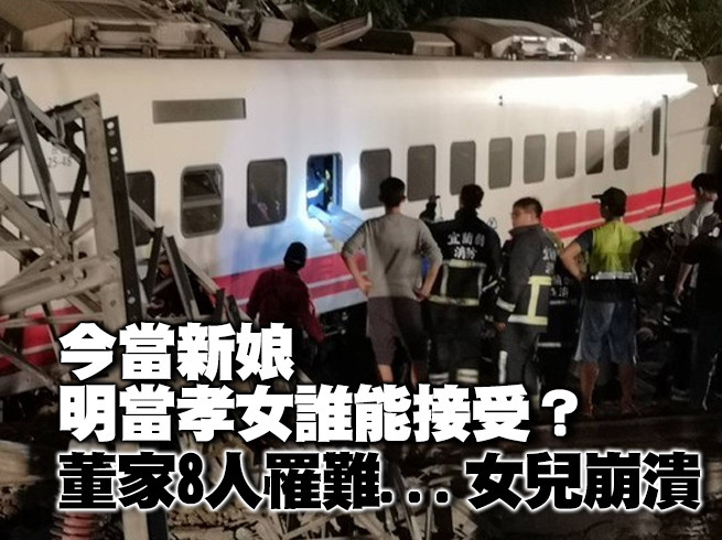 普悠瑪號6432次21日在冬山=蘇新間東正線翻覆出軌,目前造成18人不幸罹難,還有上百人受傷,其中有台東船長董進興相約17名親友北上到三峽參加二女兒婚禮,未料返家途中發生憾事,一家8口共赴黃泉。董進興大女兒22日上午接受採訪時沉痛地表示,「妹妹很自責,無法接受,今天是當新娘,明天變成孝女,這個能接受呢?」