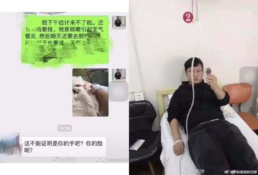 ▲▼ 男子最後傳了有點滴、臉、和時間的照片證明他真的生病 。(圖/翻攝微博/人民日報)