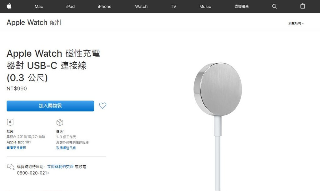 根據官網顯示,此次推出的充電線材為「Apple Watch磁性充電器對USB-C連接線」,長度為0.3公尺,銷售價格與之前的Type-A介面充電線一樣為台幣990元;現在下訂此一產品,最快於本周六10月27日即可取貨。