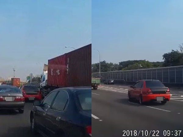 此外,在三寶車切時,先後各有大小貨車經過,險些發生碰撞,畫面怵目驚心,而最後他也直接橫跨3線道,達成了下交流道的目的。
