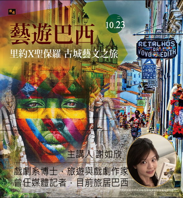 五場講座除了22日於台南登場的新書分享暨簽書會,23日在台北也有一場「《戲遊巴西》里約X聖保羅 古城藝文之旅:被壓迫者劇場的家鄉」講座,11月在新竹、台北另舉辦三場。