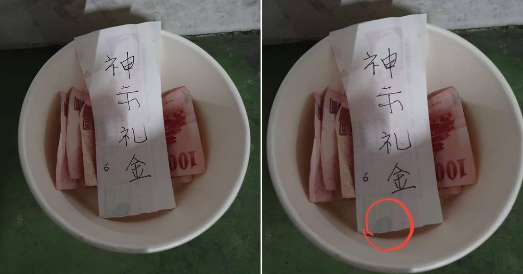只見紙碗裡除了3張百元鈔票外,最上方還有一張寫著「神示禮金」的紙條,而旁邊空白的部分又標記一個小小的阿拉伯數字6,讓人完全摸不著頭緒。