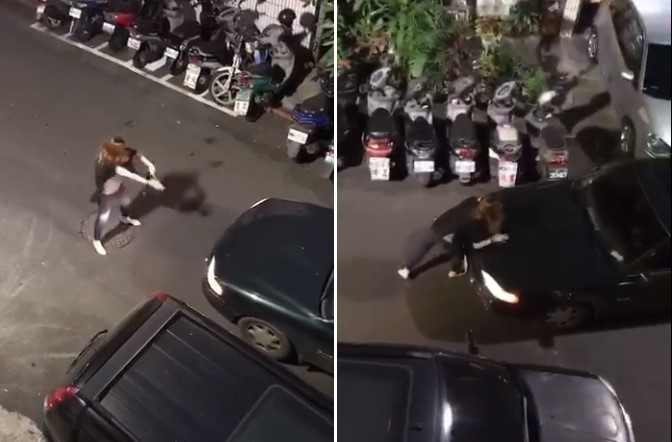 ▲女子對著轎車「發功」,還拍打引擎蓋。(圖/翻攝自Facebook/台灣新聞記者聯盟資訊平台,下同)