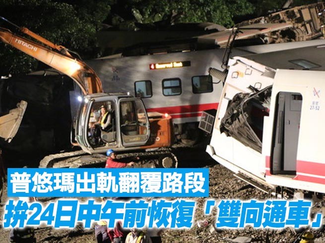 台鐵普悠瑪號翻覆出軌釀18人死亡、百人輕重傷的重大傷亡,昨事故路段單線搶通,台鐵表示,預定在周三中午前修復完成,恢復雙向通車。