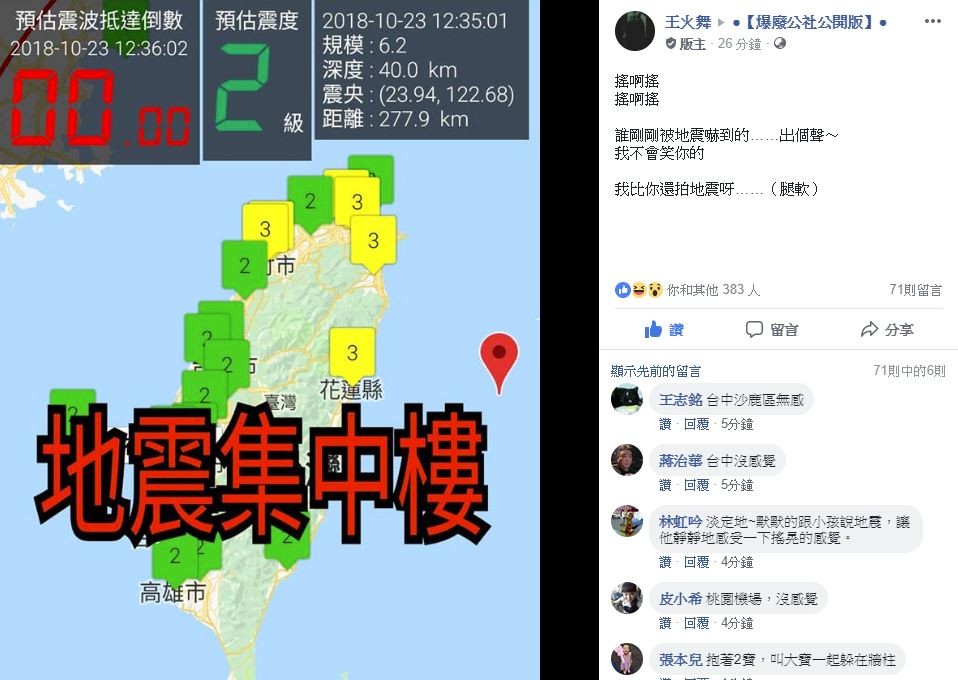 由於搖晃超過30秒,讓各地民眾十分有感,而臉書各個社團也陸續出現地震文,許多網友都表示,以為是自己頭暈,沒想到會搖這個久,驚呼「是不是開到震動模式」、「以為自己貧血,又在頭暈」、「飯桌都在搖,好暈喔」、「暈到以為自己又暈眩發作」、「 吃個午餐想說頭怎暈很大」、「我以為我頭暈(桃園一樓」、「真的地震了,我也以為是我頭暈」。