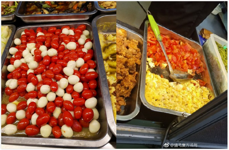 微博帳號「鱼籽馅」22日在在微博分享番茄炒蛋的照片,並且發文提到「我的天啊!學校裡的番茄炒蛋跟產卵了似的。」鐵盤中,原本的滑蛋變成一顆顆的鵪鶉蛋,而牛番茄也換成小番茄,保持原狀且粒粒分明的拌炒在一起。