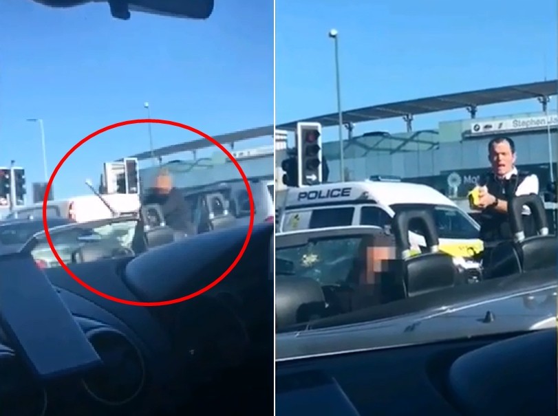 「Oh my god!這人在幹什麼?」英國恩菲爾德(Enfield)一名女子開車等紅綠燈途中,發現右前方有個光頭男子拿著棍棒下車,還開始往敞篷BMW的擋風玻璃砸去,嚇得她趕緊報警。警方到現場後開始勸阻,但見砸車男子不願配合後,直接拿出電擊槍連開2槍逮捕。