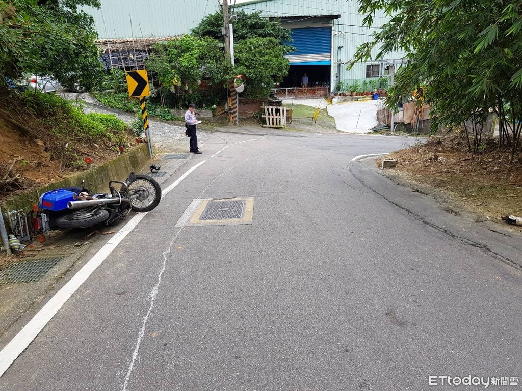 ▲機車倒臥路旁,騎士命危送醫急救。(圖/記者陳豐德翻攝)