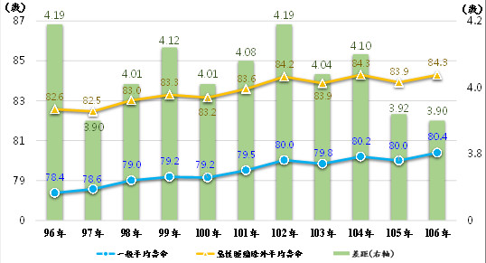 關於「一般國人平均壽命」內政部指出,係指運用全部死亡人數之死亡機率去推算國人平均壽命;「特定死因除外國人平均壽命」係指排除該項死因後死亡人數之死亡機率去推算國人平均壽命。
