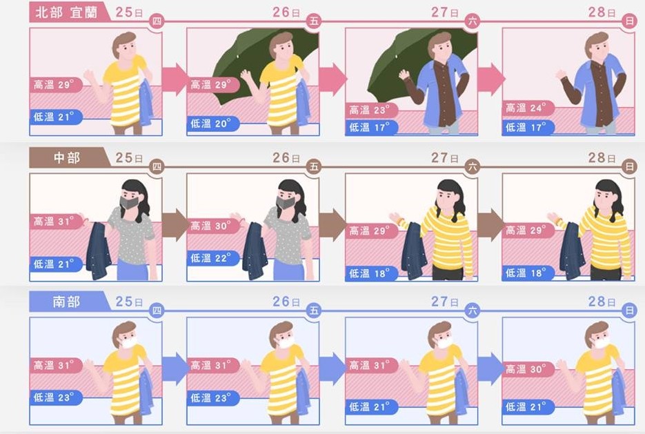 根據氣象局預報,週四(25日)至週五(26日)白天的天氣大致舒適溫暖、降雨不多,但週五晚起至週六(27日)鋒面通過及東北季風增強,北部及東北部地區容易下雨且白天氣溫明顯下降。天氣風險公司稍早在臉書分享一張圖,教大家未來4天穿衣小撇步。