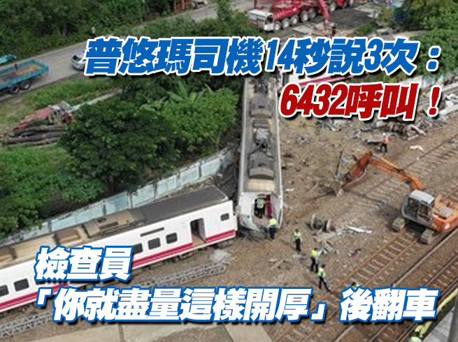 6432次普悠瑪翻車前43分鐘通聯紀錄曝光,戳破台鐵謊言!司機尤振仲在出軌前3分鐘有告知「現在變成ATP關起來」,且調度員也回應「ATP關起來會好嗎」,打臉台鐵說法。而司機在出事前43分鐘不斷求救,14秒連說3次「6432呼叫」;檢查員說「原則我會幫你換車,我會叫花蓮換車」、「那你就盡量這樣開厚」,20多分後不幸翻車造成18人罹難。