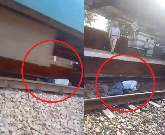 ▲阿米特蜷縮在鐵軌中間的小空間裡,躲過疾駛而來的火車。(圖/翻攝自推特/keshaboinasridhar)