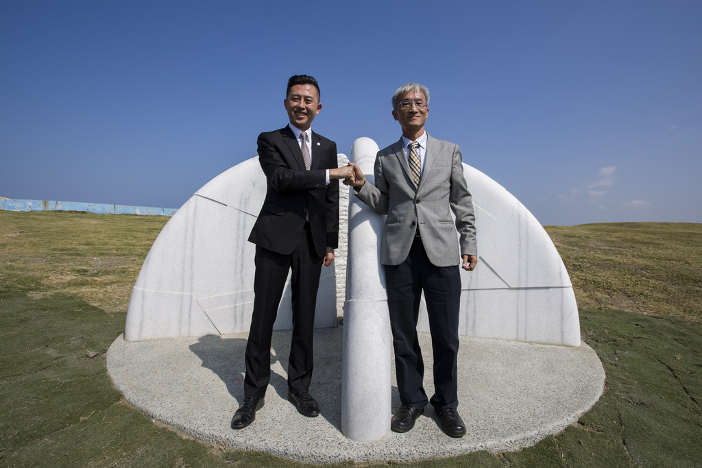 為促進藝術文化交流,明基友達文教基金會與新竹市政府合作推廣公共藝術,讓一般民眾也能親近國際級的藝術作品,基金會特別捐贈法國藝術家艾瑞爾˙穆索維奇所創作,由白色大理石打造的「空間之間」(The space between),今(25)日在新竹漁港國際風箏賽場,由新竹市長林智堅與基金會執行長童文池共同揭幕,林智堅表示,漁人碼頭在大師石雕作品點綴下,更有人文藝術氣息。