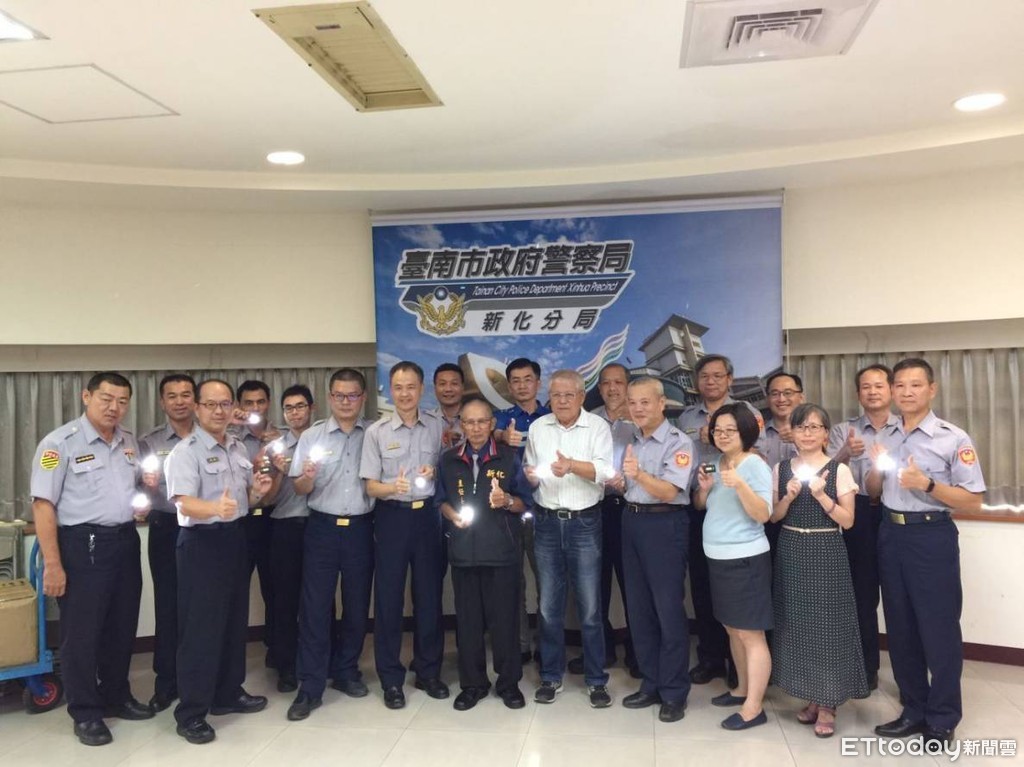 ▲台南市新化朝天宮管理委員會主任委員許滄淵,製作LED鑰匙圈致贈新化警分局,供打詐、掃黑、反毒等預防犯罪、交通宣導時致贈民眾用。(圖/記者林悅翻攝)