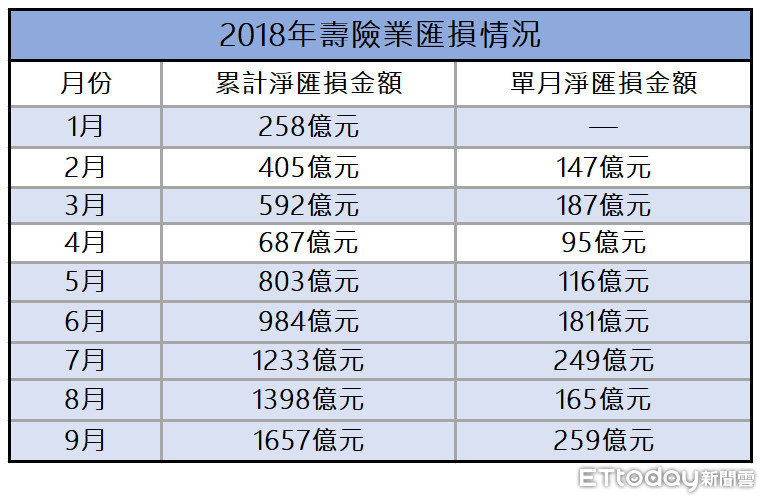 以今年單月壽險業匯損來看,9月單月匯損259億元,是今年匯損最嚴重的一個月;今年以來,除了7月單月匯損249億元,跟9月匯損259億元外,其餘月份匯損都控制在200億元以內。