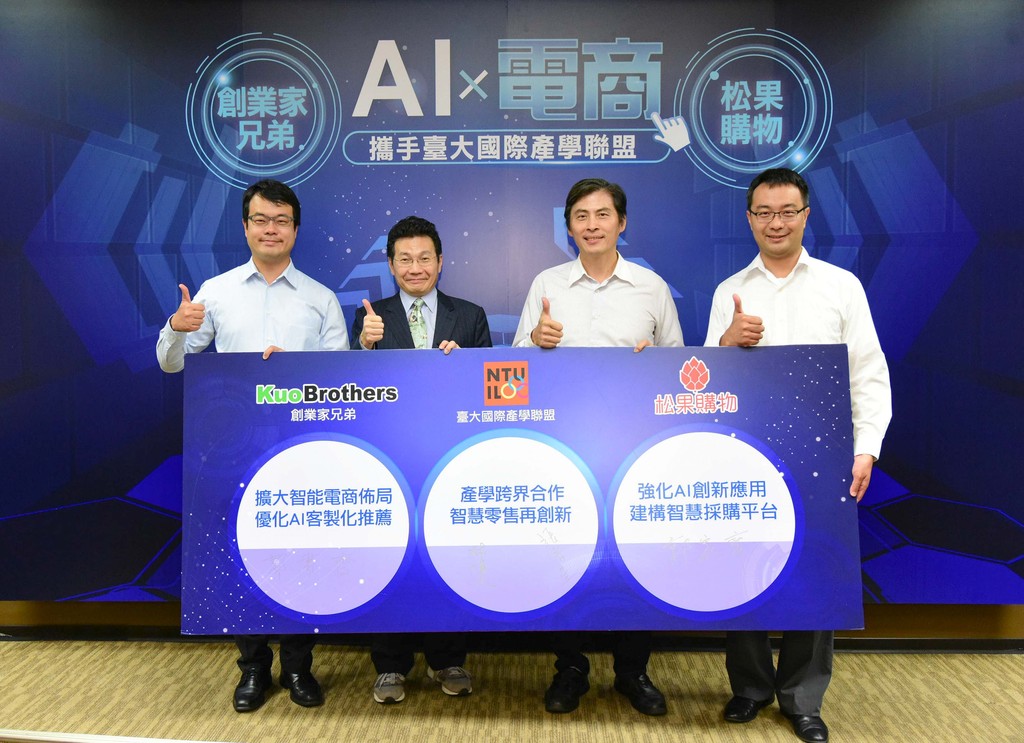 ▲創業家兄弟與臺大國際產學聯盟簽訂AI技術研發合作契約,將與松果購物一同導入臺灣大學的AI人工智慧創新技術。由左至右分別為創業家兄弟郭書齊董事長、臺大國際產學聯盟林博文主任、臺灣大學張智星教授、松果購物董事長郭家齊。(圖/業者提供)
