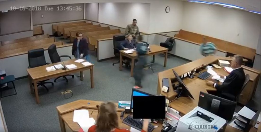 據《ABC NEWS》報導,事情發生在奇黑利斯(Chehalis)的路易斯郡地方法院(Lewis County District Court)。從法院的監視器畫面可以看到,當時一共有4名嫌犯出庭受審,卻僅由1名法警看守。銬著手銬的4人排著隊,準備輪流接受審判,不過突然間,排在隊伍最後的28歲男子霍華德(Kodey Howard)及22歲男子雅各森(Tanner Jacobson)卻趁隙往門口狂奔,打算從4樓一路逃到1樓出口。