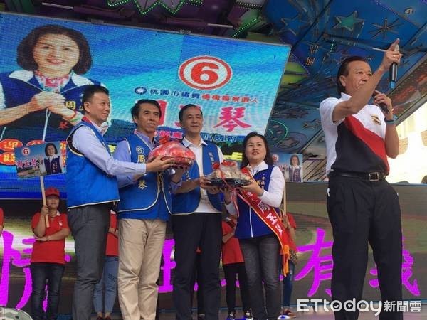 ▲朱立倫回桃園為陳學聖輔選。▼為黨籍楊梅區市議員候選人周玉琴、涂權吉加持。(圖/陳學聖競選總部提供)