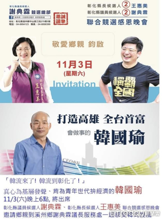 國民黨彰化縣黨部28日在臉書粉絲團貼文,「天氣轉涼,請注意保重身體,韓流來了。」並附上11月3日彰化縣議長也是下一屆彰化縣議員候選人謝典霖舉行感恩晚會邀請函,預告國民黨高雄市長候選人韓國瑜將出席站台,是韓國瑜第一次親自到彰化為候選人助選的公開行程。