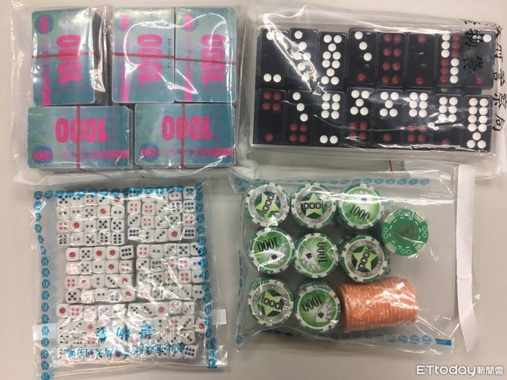 ▲警方在天九牌職業賭場查扣大批籌碼骰子等賭具。(圖/記者張君豪翻攝)