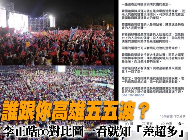 李正皓28日發文指出,韓國瑜與陳其邁先後在鳳山舉辦造勢晚會 ,從兩人的造勢晚會現場照片,可以很清楚地看出韓國瑜與陳其邁最大的差別,「韓國瑜造勢晚會的人是用站著;陳其邁造勢晚會的人是用坐著」。