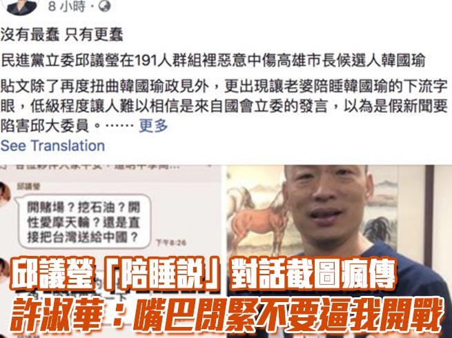 許淑華表示,邱議瑩在191人群組裡惡意中傷韓國瑜,貼文除了再度扭曲韓國瑜政見外,更出現「讓老婆陪睡韓國瑜的下流字眼,低級程度讓人難以相信是來自國會立委的發言」,以為是假新聞要陷害「邱大委員」。