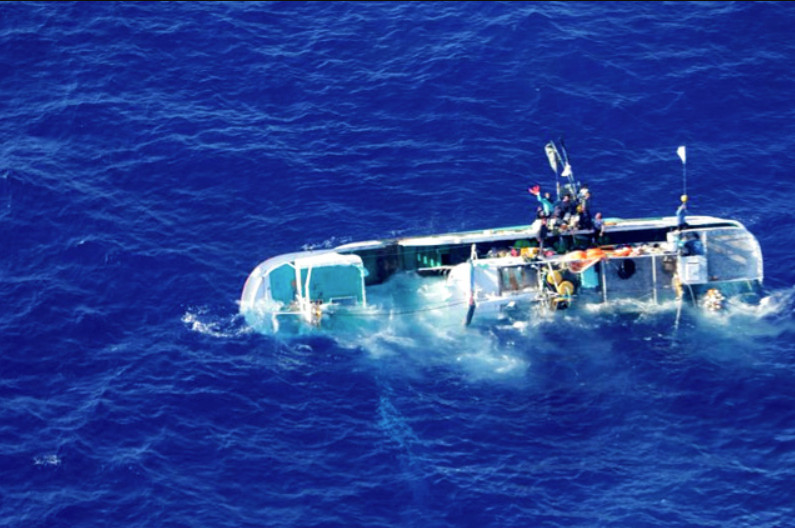 ▲這艘漁船向左側翻覆,船上漁工只好爬上右船舷等待救援。(圖/海上保安本部第三管區)