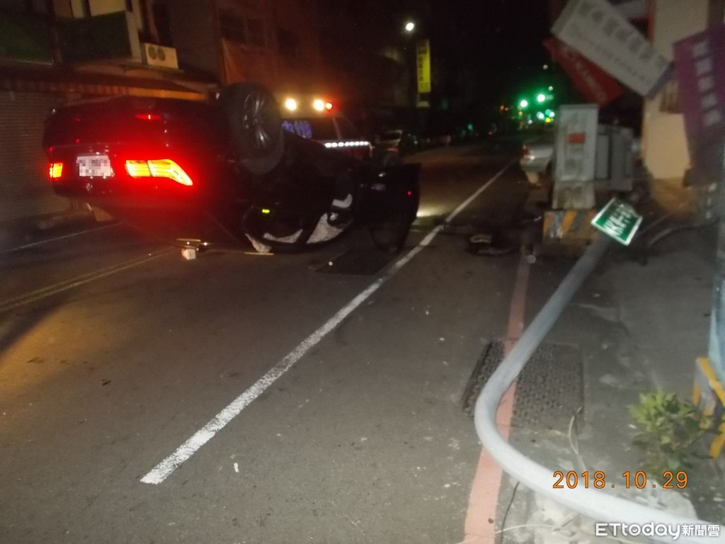 陳姓男子29日凌晨3點多開BMW自撞路燈桿及台電控制箱,整輛車180度翻覆,路過民眾協助陳男脫困,陳男一聽到路人報案轉身落跑,但因酒醉走了100公尺就腿軟倒地;陳男向警稱「車不是我開的」,但酒測值達1.21毫克,警訊後依公共危險罪送辦。