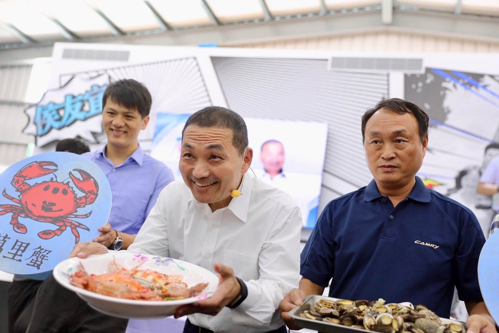 國民黨新北市長候選人侯友宜29日上午舉辦「漁夫市集起跑記者會」,邀請從事萬里蟹捕撈的漁民第二代吳軍緯、貢寮養殖鮑魚「百大青農」李勝興,以及貢寮鮑達人吳勝福,一同展示豐富的萬里蟹蒸籠以及現烤貢寮鮑。侯友宜忍不住記者會現場大啖萬里蟹、貢寮鮑,還大讚「有夠嫩還有甜甜海水味道」。