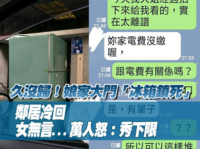一名女網友昨天收到照片,位於屏東潮州的老家,竟被鄰居用冰箱堵住大門,傻眼的她質問對方,只得到「你家電費沒繳」的回應。她表示,雖然家人已搬走10多年,但偶爾還是會回去巡視,同時也向隔壁鄰居喊話,「請你們自重。」