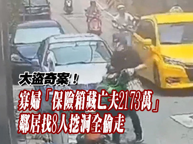 新竹一名48歲楊姓婦人因丈夫生前從事漁船走私,擔心面臨罰款,今年4月將亡夫留下的2173萬領出,藏到租屋處的保險櫃中。鄰居呂姓男子目睹運鈔過程後,立刻找來8名同夥分工,策劃如何盜走鉅款。一行人歷經1個月準備,今年6月將保險箱鑿開一個大洞,得手大筆現金;目前有7名嫌犯落網遭起訴,但仍有2人在逃。