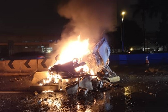 ▲ 馬來西亞一輛賓士轎車失控翻覆,華裔駕駛遭活活燒死。(圖/雪蘭莪州消防局,下同)