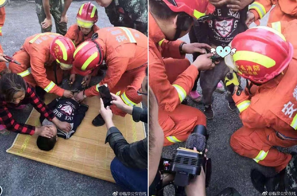 照片中,男童平躺在草蓆上臉色慘白,表情看起來還有些驚恐,一旁穿著格子上衣的婦人疑似是家人,還用手覆蓋住眼睛不讓他看到「救鳥」過程;而3名消防人員蹲在旁邊,手上拿著各式各樣的工具,接著可能是受到角度限制問題,又從躺姿改成站姿,經過一番努力才成功拉開夾住下體的兩塊磁鐵。