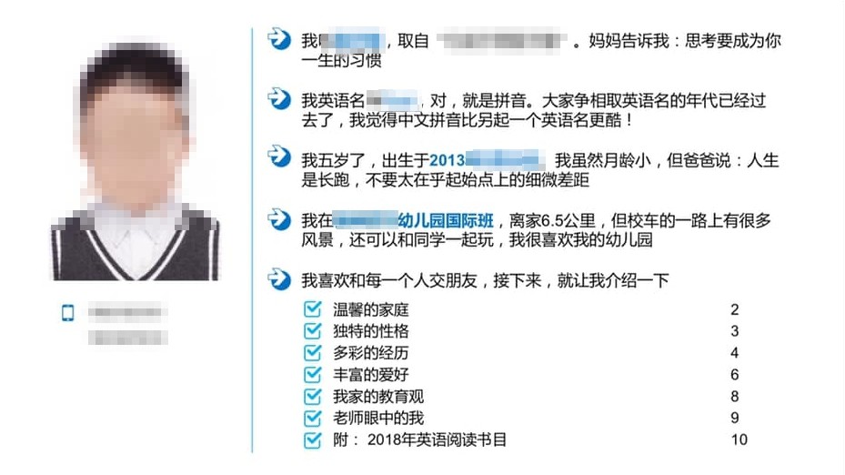 從男童的履歷可以清楚看到,他引用媽媽的話「思考要成為你一生的習慣」,爸爸則叮囑說「人生是長跑,不要太在乎起始點上的細微差距」。男童的爸媽都畢業於復旦大學,目前都任職公司高階主管,他自我期許,「作為一個典型的『復(旦)二代』,我要青出於藍勝於藍。」