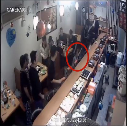 位於新竹縣新埔鎮上的這間涮涮鍋,在30日晚上10點多來了三名男子,監視器畫面只見到幾名男子言語談論間開始推擠,期間雖有勸架但是越勸越慘,你一拳我一拳的突然間就打起來,兩方人越打越兇,疑似為客人的這邊見店員躲進吧檯內還不放棄,拿起桌上東西狠砸,只見一名身穿灰色短袖上衣男子單手拿起吧台上的湯壺,卻沒預料裡面裝滿了湯,熱湯撒了自己滿身不說,自己還被湯絆倒,2秒鐘的那股兇狠勁畫風卻急轉直下,整個人狼狽摔倒在地。