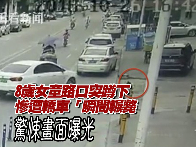 瞬間的天人永隔!大陸深圳寶安區26日下午4點發生致命交通意外,一名年僅8歲的女童在過馬路時然蹲下,結果被右轉的白色小轎車輾死,整個驚悚過程都被監視器拍下。