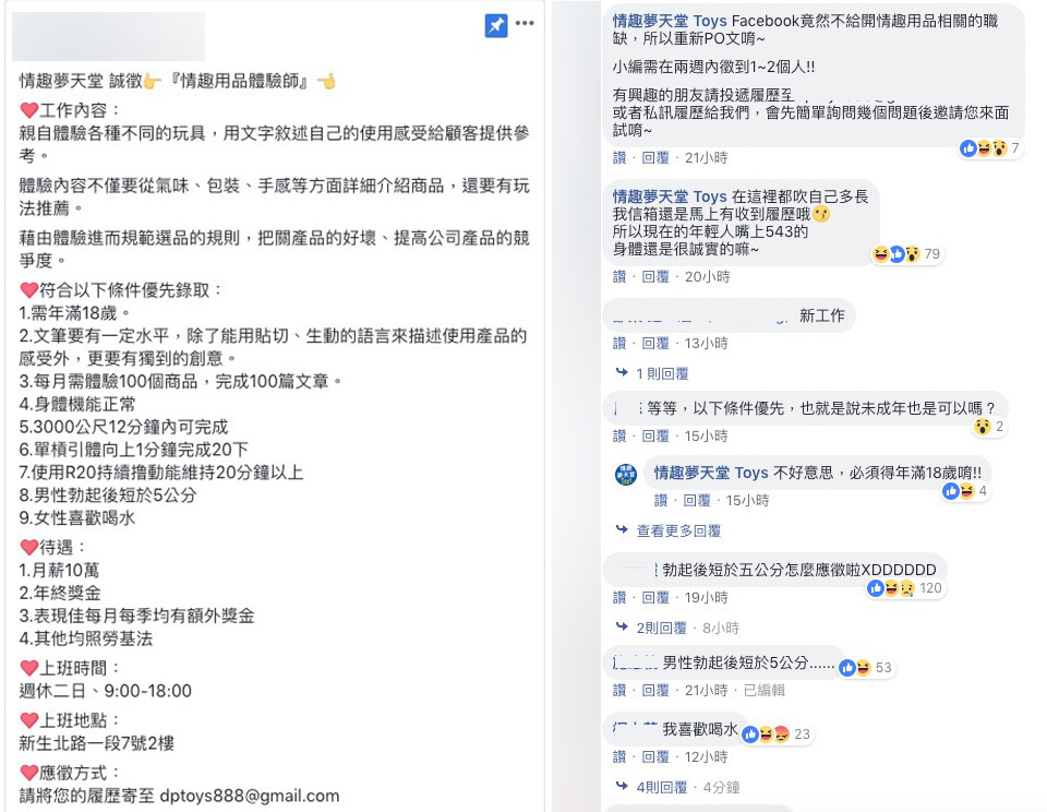 臉書粉絲專頁有一篇誠徵「情趣用品體驗師」的貼文,工作內容為「親自體驗各種不同的玩具,用文字敘述自己的使用感受給顧客提供參考。體驗內容不僅要從氣味、包裝、手感等方面詳細介紹商品,還要有玩法推薦。藉由體驗進而規範選品的規則,把關產品的好壞、提高公司產品的競爭度。」