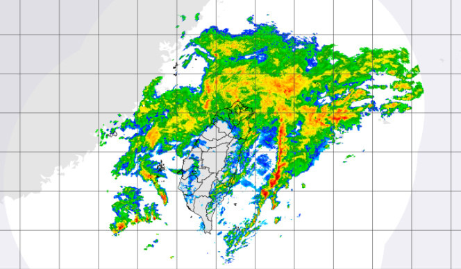 ▲在雷達回波圖顯示就像是戴了綠色神帽。(圖/翻攝自中央氣象局,下同。)