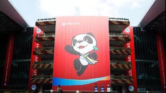 ▲近博會主場館外,吉祥物貓熊「進寶」大型迎賓看板 。(圖/翻攝中國國際進口博覽會微信公眾號)