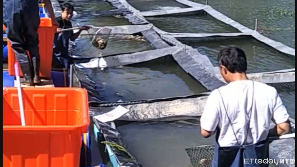 ▲苗栗縣衛生局人員前往養殖場進行打撈清點,發現短少1400公斤大閘蟹。(圖/記者黃孟珍翻攝)