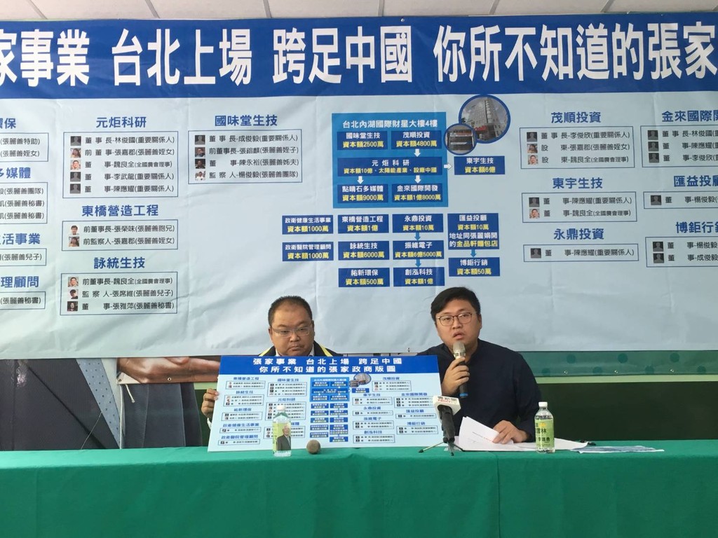 李進勇陣營指出,位於台北市內湖區「國際財星」大樓的4樓,共登記「 國味堂生技股份有限公司 」、「茂順投資股份有限公司」、「元炬科研股份有限公司」、「金來國際開發股份有限公司」、「點睛石多媒體股份有限公司」5家公司,資本總額高達13億4300萬,並將工廠設於大陸,雖然目前董監事都沒有掛名「張家人」,但凡走過必留下痕跡,網路歷史資料中能發現,公司有不少複雜的投資關係。