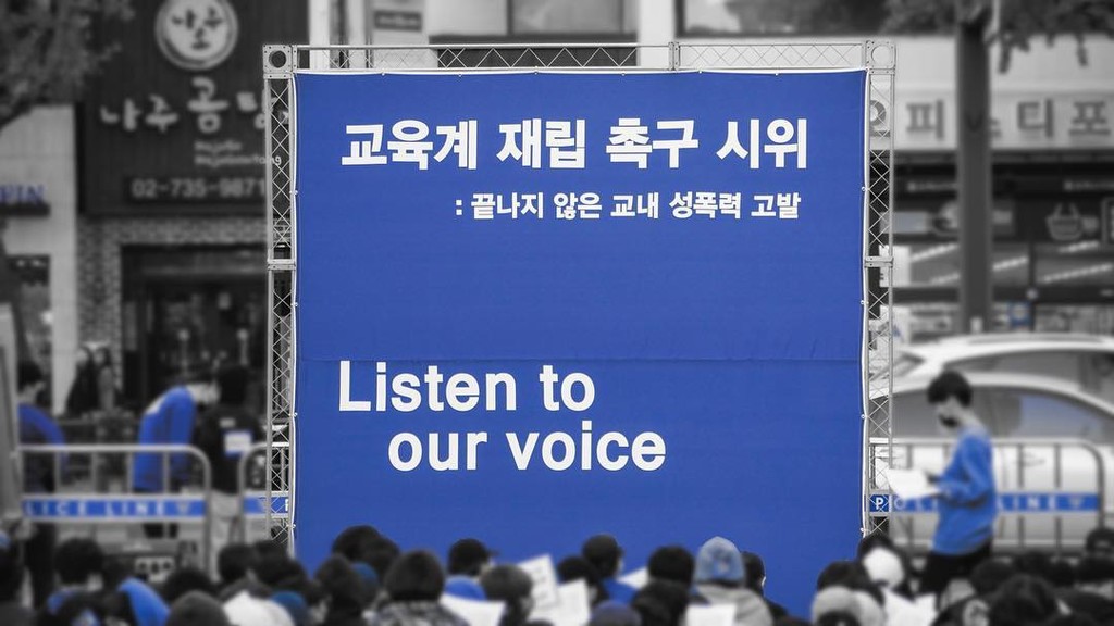 「老師的性騷擾行為太頻繁了,而且越來越嚴重。」在3日南韓「學生節」當天,首爾中區金融中心前聚集超過250名穿著校服的國高中女學生,將一首讚頌老師的歌曲改詞後,大聲唱出她們的抗議心聲。這場學校#MeToo活動名為「沒有為了女學生的學校」,由30多個青少年女性主義團體主辦,預計18日在大邱舉行第二次活動。