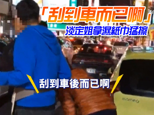 當時雙方你一言我一語,在大馬路上爭執不下,豈料下一秒婦人突然掏出濕紙巾,彎腰就朝前車刮傷處猛擦,還沒好氣地說「刮到車後而已阿」,讓原PO夫婦當場傻眼,決定報警處理。