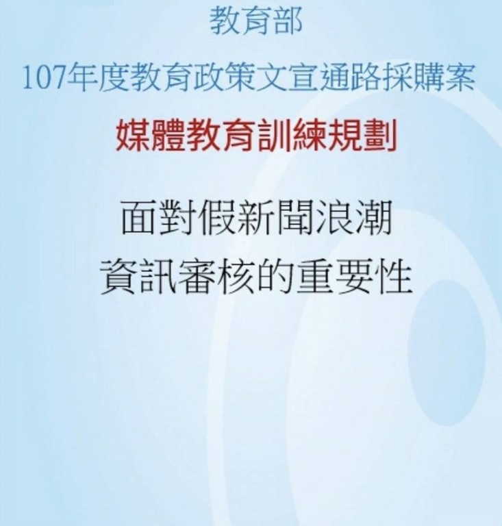 教育部次長姚立德向《ETtoday新聞雲》記者指出,每年年初教育部的政策包括反毒、12年國教課綱等,都會對外開放媒體進行招標,屬開口合約,希望透過媒體宣導讓民眾更知道正確訊息,今年是民視和凱擘2家得標,依照規定得標公司年底前都要回饋給教育部一堂課,提升同仁新聞媒體相關的識能,因最近假新聞頻傳,今年課程才以這為主題。