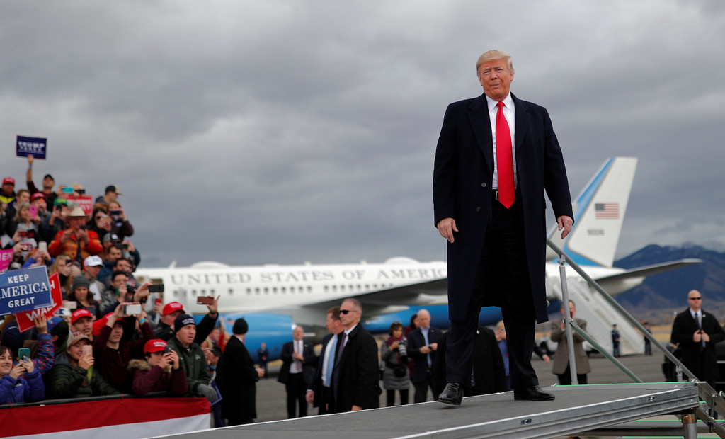 ▲美國總統川普3日在蒙大拿州博茲曼黃石機場造勢。(圖/路透)