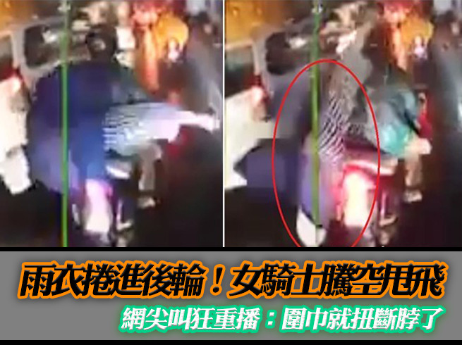 一名許姓網友轉傳一支國外影片到社團提醒其他人,「下雨天乘坐機車時,請留意雨衣是否太長!」否則就會像影片中的女乘客一樣,當場被甩出,恐怕還會有奪命的危機,幸好天雨路滑,旁邊的汽機車都不快,才沒發生意外。