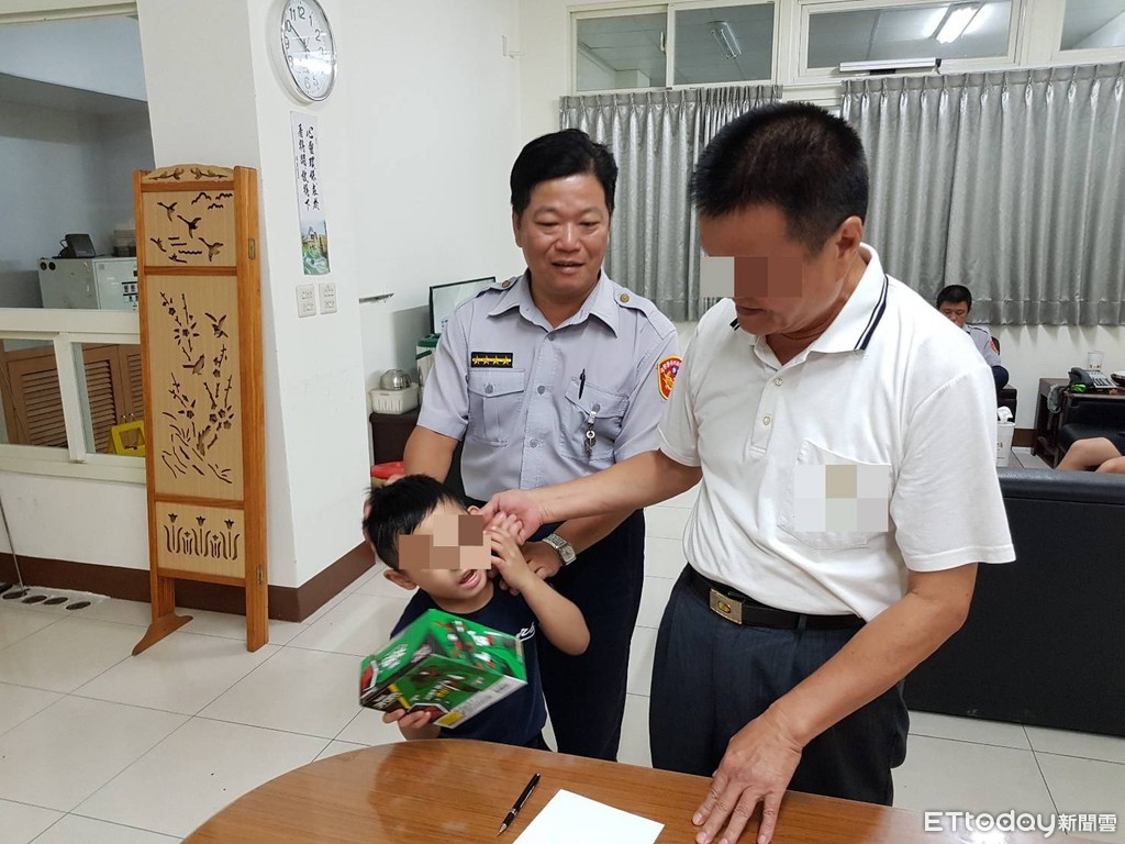 「誰家走丟了小孩?」屏東縣里港警分局鹽埔派出所員警執行巡勤務,接獲報案發現1名幼童在街口張望,找不到阿公,利用廣播系統廣播通知,20分鐘後,幼童的阿公急忙跑到分駐所帶回,阿公擔心之餘也輕輕捏了他的臉頰,提醒他以後不能再這樣亂跑出門。