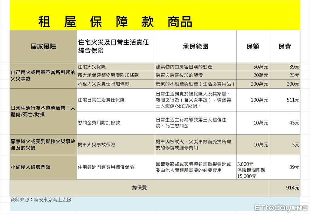 這類「住宅火災與日常生活責任保險」的保單為一年一期,符合租屋契約的一年一約,民眾也無須擔心保險會在承租期間失效。