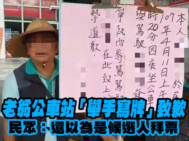 ▲老翁舉著手寫的告示牌向公車司機道歉。(圖/記者郭世賢翻攝,下同)