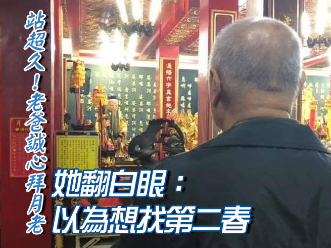 這位女網友日前和爸爸到廟裡拜拜,依照順序來看,月老是在最後的第9爐,但原po父親才拜到第2爐就一直問「月老咧?月老在哪裡?」好像有話急著說。終於撐到最後一爐時,「竟然給腦娘站了超久」,還對月老說了很多話,讓女兒無奈大喊,「臭阿爸,不知道的人以為你想找第二春!到底是多想把我甩掉?就說了我要讓你服侍一輩子ㄟ!」